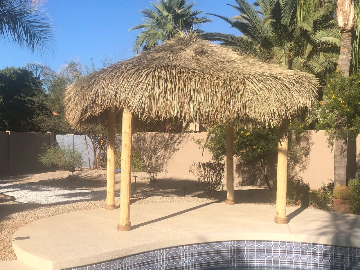 The Palapa Company offers standard large 9' and huge 12' palapa (umbrella) kits and each palapa kit includes: one hand-peeled 6” diameter pine lodge pole with pre-cut and pre-drilled supports, two commercial quality thatches (hand-tied palm rain cape), stainless and zinc-coated hardware, and a of course a detailed installation guide that will walk you through every step of the turn-key installation process.